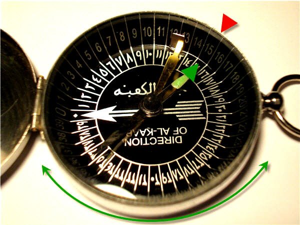 In addition, a Qibla compass of 40 zones can do this when the magnetic needle is made to point to a specific number referring to the location of performing prayers. Then, the arrow refers to the Qibla.