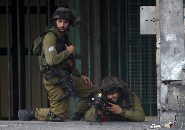 Illegal Israeli settlers throwing stones at Palestinian homes in Al-Khalil, Hebron, October 9, 2015. Illegal Israeli occupation soldiers aiming his weapon at Palestinians in Al-Khalil, Hebron, October 9, 2015.