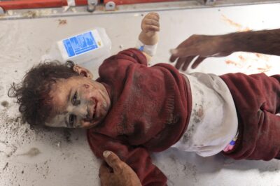 A Palestinian girl who was killed by an Israeli genocidal air strike on Gaza, file, November 21, 2023 An injured child carried by his father, a victim of the Israeli war on Gaza, November 21,