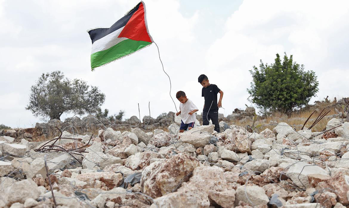 Two children, from the Fakhri Abu Dthiyab family, flying a Palestinian flag over