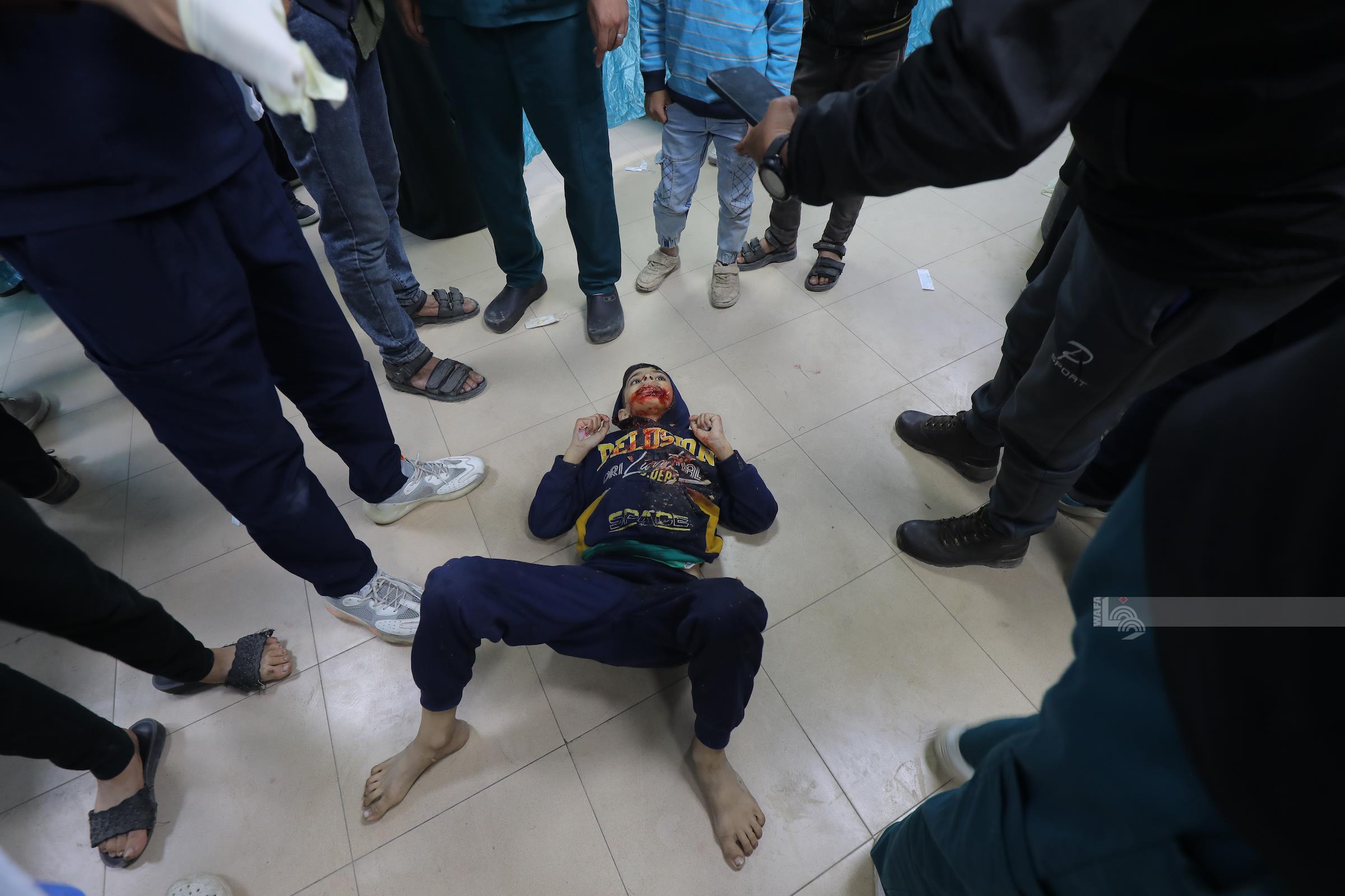 Palestinians who were injured by Israeli genocidal air strikes and bombardment arriving at Shuhada Al-Aqsa hospital, in Dair El-Bala'h, February 11, 2024 More Palestinians who were injured by Israeli genocidal air strikes and bombardment arriving at Shuhada Al-Aqsa hospital, in Dair El-Bala'h, February 11, 2024