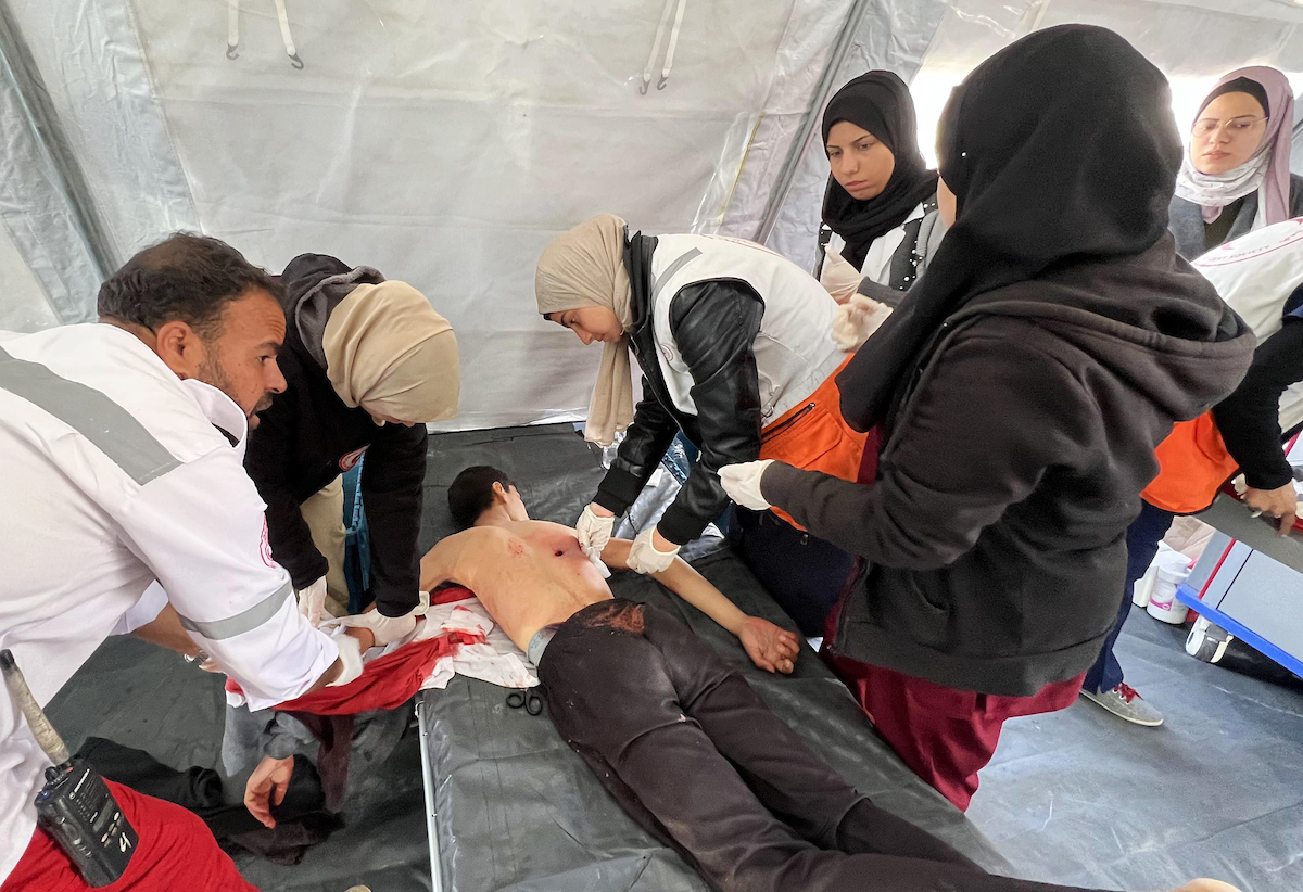 A destroyed Palestinian ambulance, part of the systematic Israeli destruction of the medical infrustructure in Gaza Strip, February 9, 2024 Treating an injured Palestininan young man, who was among the victims of the Israeli genocidal air strikes on Gaza Strip, February 9, 2024