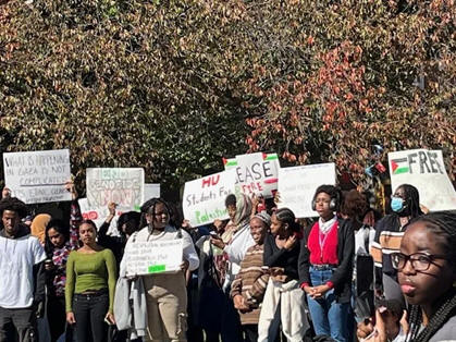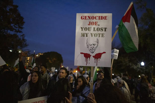 A demonstrator holding a sign with Genocide Joe, You Lost My Vote written on it, another flying a Palestinian flag, during a White House protest, November 4, 2023 African American students at Howard University showing support for the