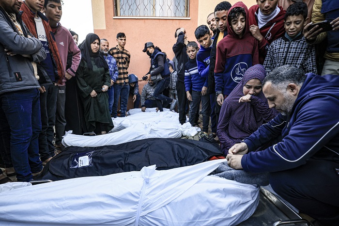 Grieving relatives who were killed by Israeli genocidal air strikes on Gaza Strip, January 6, 2024 Performing funeral prayer on Palestinian victims who were killed by Israeli genocidal air strikes on Gaza Strip, January 6, 2024