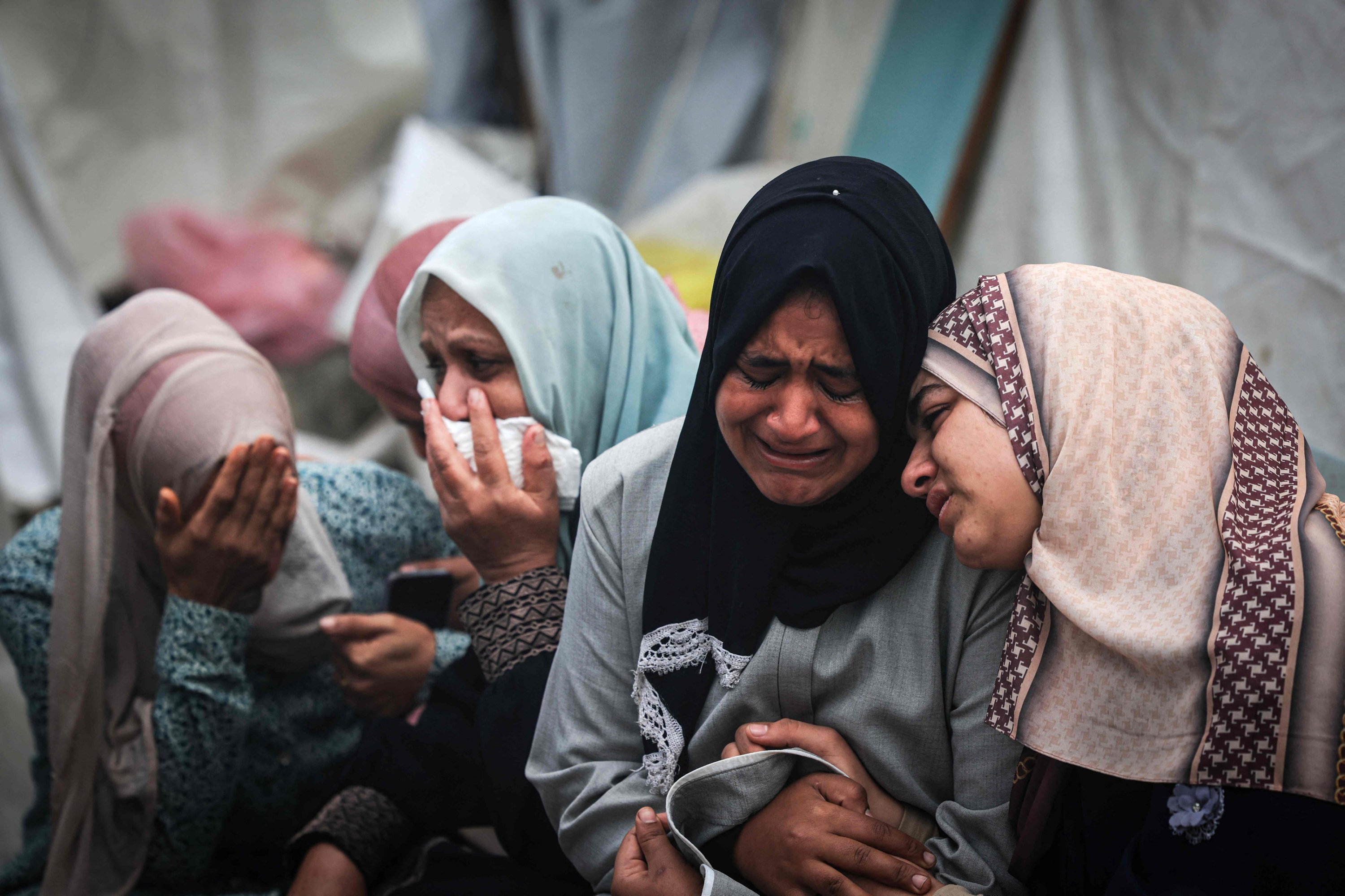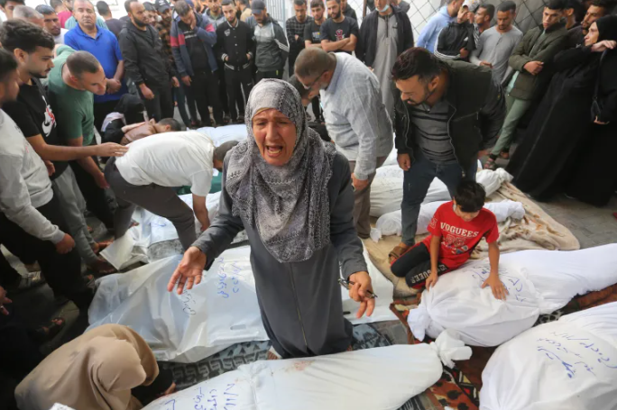 Palestinians mourn their relatives, who were killed in the Israeli genocidal bombardment of Rafa'h, on November 7, 2023
