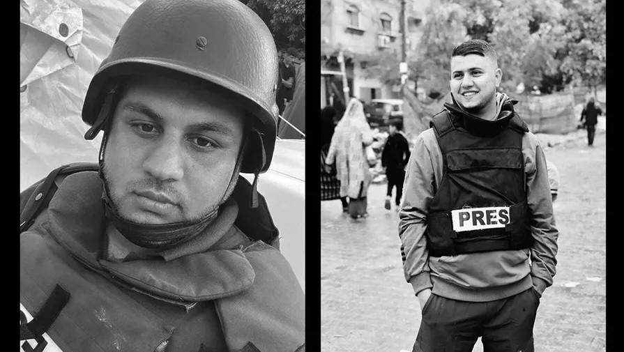Palestinian journalists 'Hamza Al-Da'hdou'h and Mustafa Thuraya, who were killed by Israeli genocidal air strike on their Press-marked vehicle in west of Khan Younus, January 7, 2024 A'hmed Mu'harib, 28, was killed by Israeli occupation forces in 'Abein,