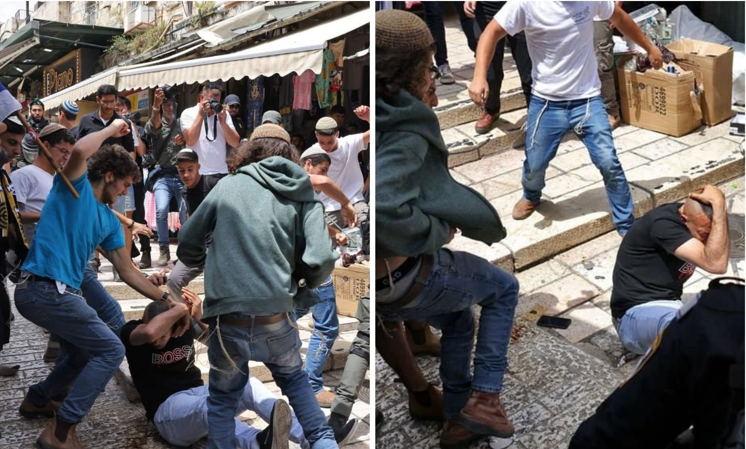 settlers severely beating the young man, I'hsan Sa'abna, in Um