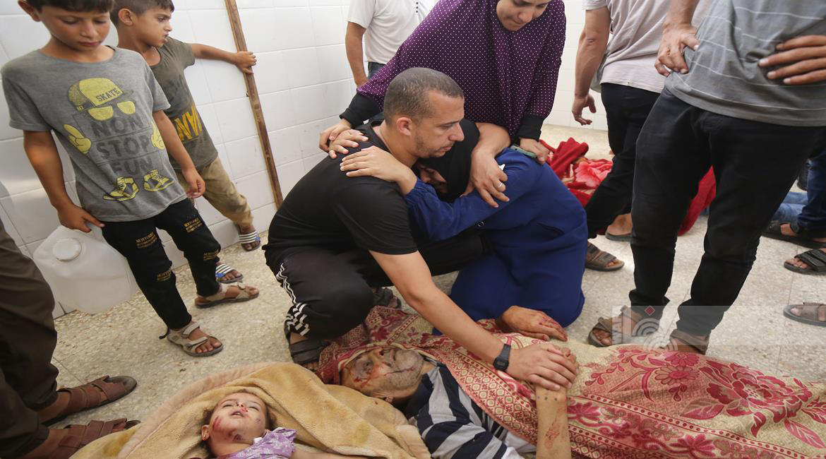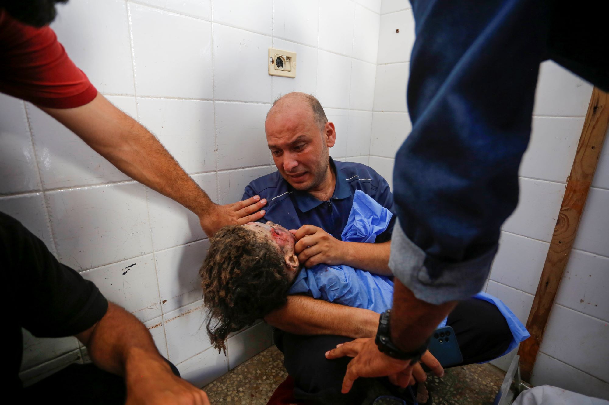 Grieving at Dair El-Bala'h hospital the death of the Palestinian