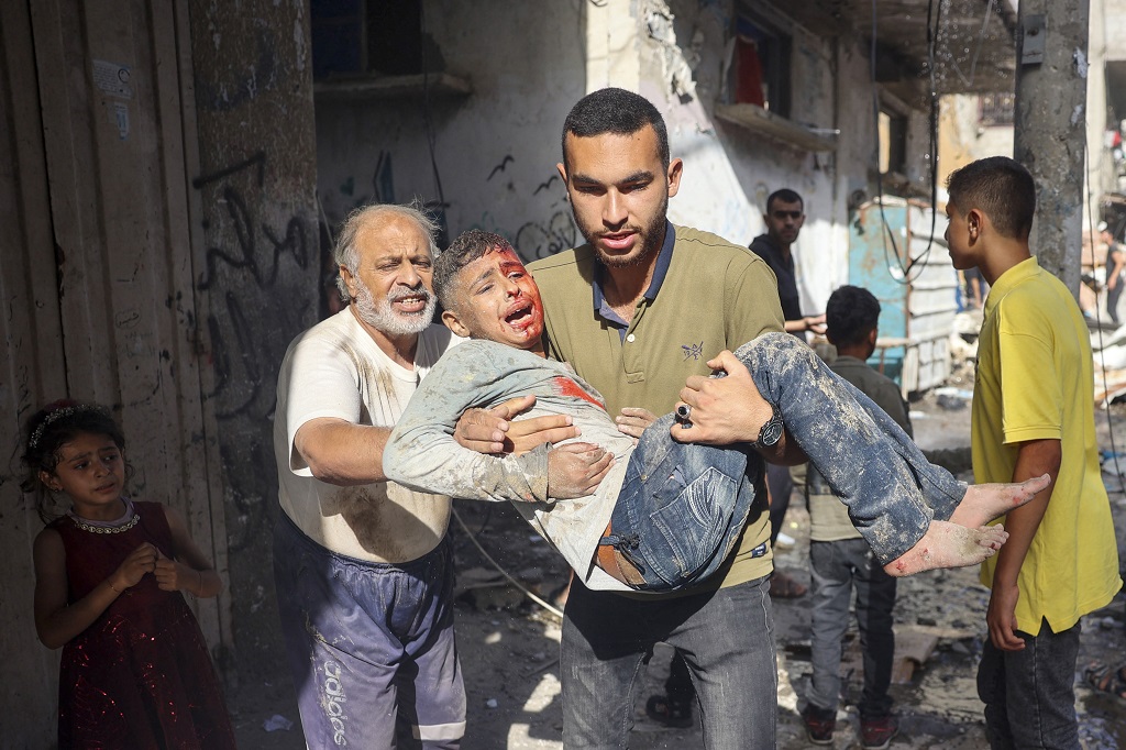 A man carrying an injured Palestinian child, while running to