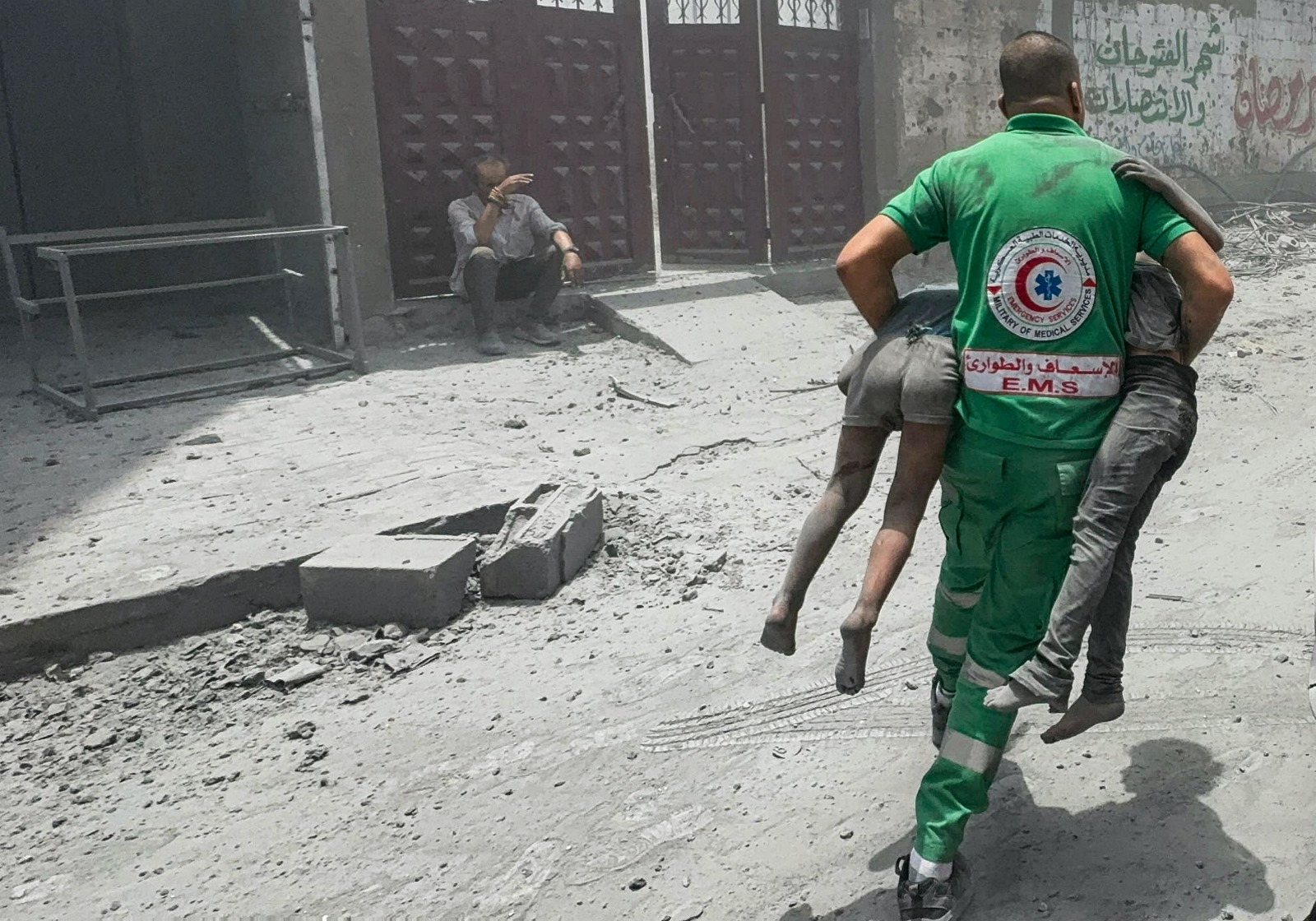 A Palestinian Red Crescent worker carrying two children who were