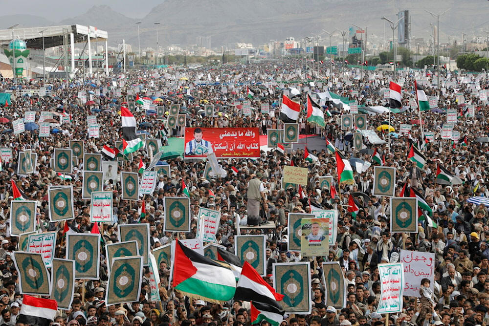 Yemenis in San'aa carry copies of the Quran and Palestinian