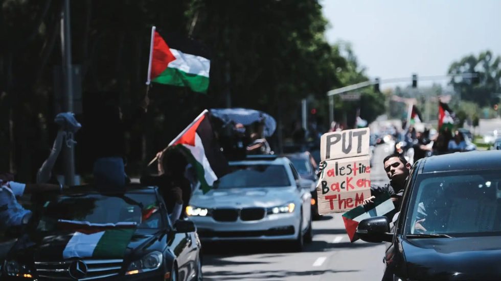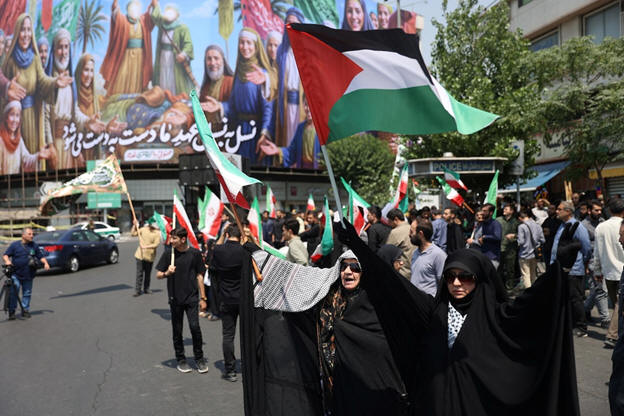 Iran, flying Iranian and Palestinian flags, in defiance to