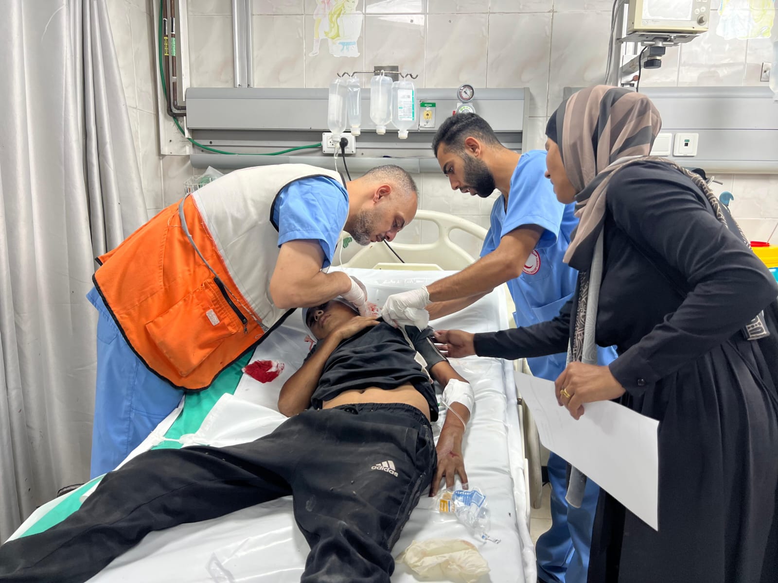 Carrying, to El-'Awda hospital, injured Palestinians who were