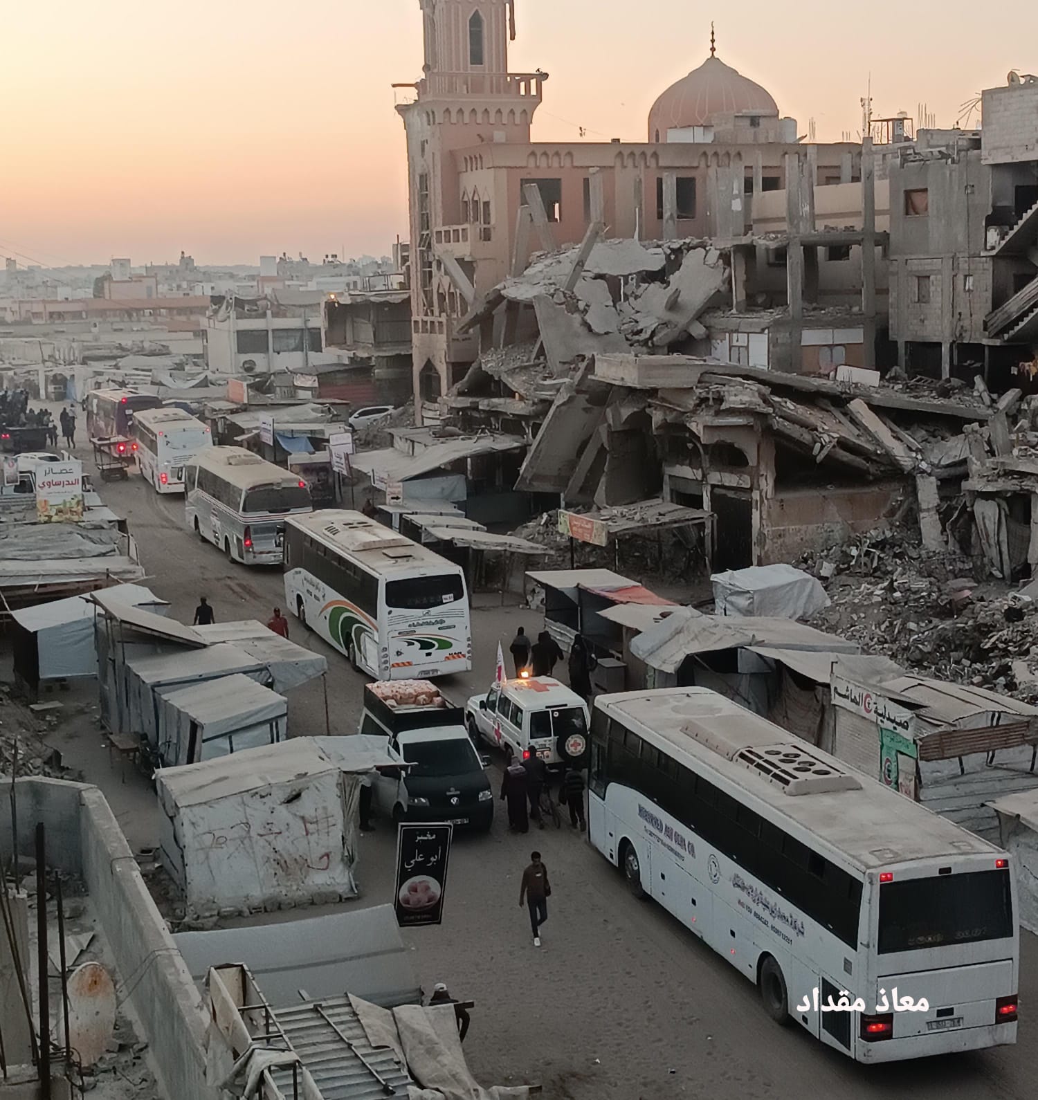 Part of the ceasefire deal, Red Cross vehicles waiting, at the Kissovim crossing, to receive corpses of 60 Palestinian martyrs, which were in the Israeli captivity, many of them showed signs of torture, on October 16, 2025.