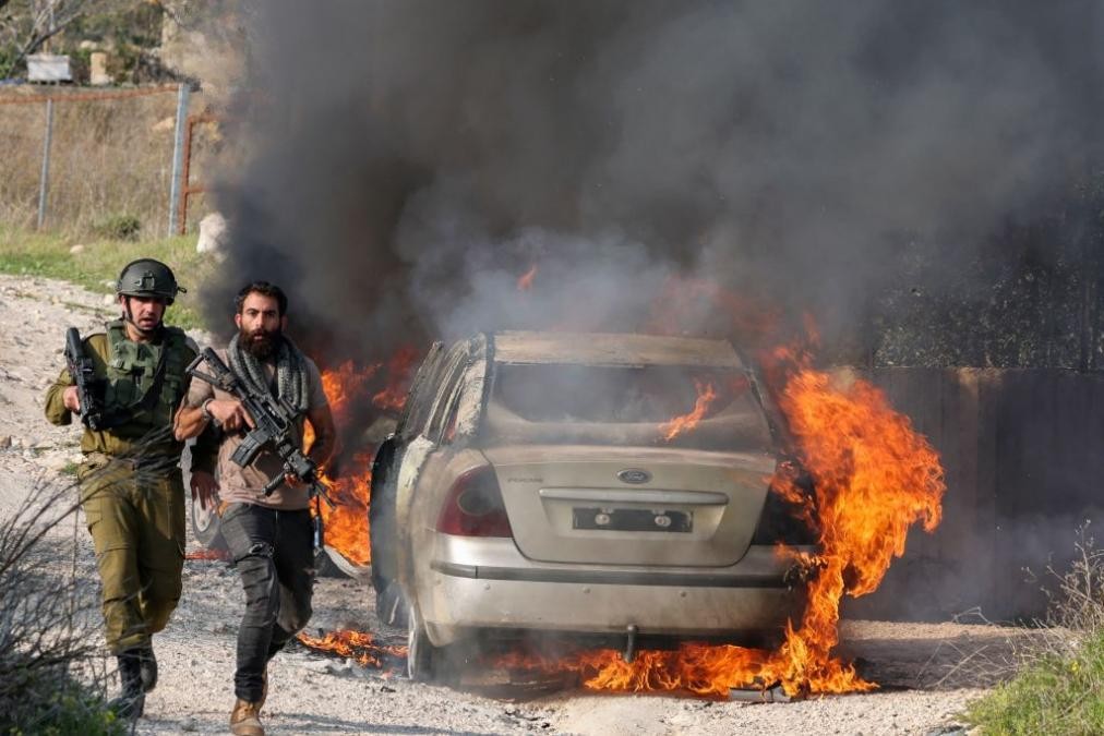 A group of the illegal Israeli settlers attacked the Palestinian town of Baiteen, in eastern Ramallah and set fire to a Palestinian car at dawn, on October 14, 2025. A group of the illegal Israeli settlers went on a rampage through an olive grove in Bardala village, in the Palestinian Jordan Valley of, uprooting and destroying dozens of the hundreds-year-old trees, October 14, 2025.